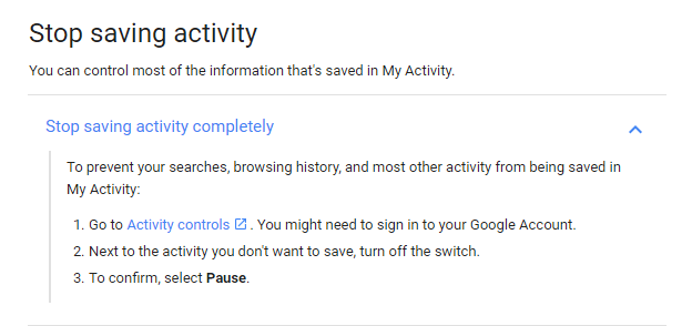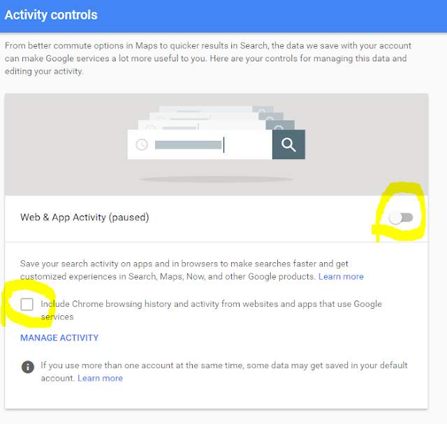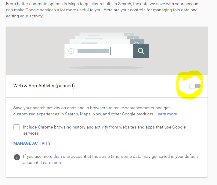 Review this page "Activity Controls" and use slider to the right to pause you Browsing History.Step 4