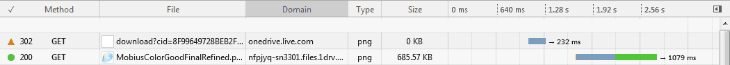 Chrome indicates 1 line for a redirect for this request and is took in total 744ms or .7s to complete both request! Remember this is a .5Mb image size.