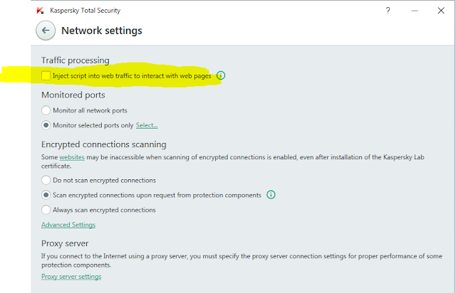 If you look at page source of any website and see a similar line in the source, then you have the Kapersky injection issue.
