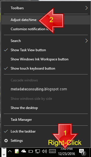 Right-click the time in system tray (1) and choose Adjust date/time (2)