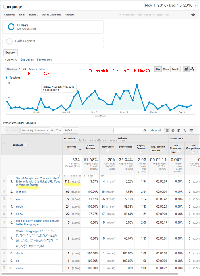 In the 2nd Google Analytics screen shot is drill down in the Language called "Secret.google.com You are invited! Enter only with this tick URL. Vote for Trump!" for the same period. A surge of fake traffic appears.