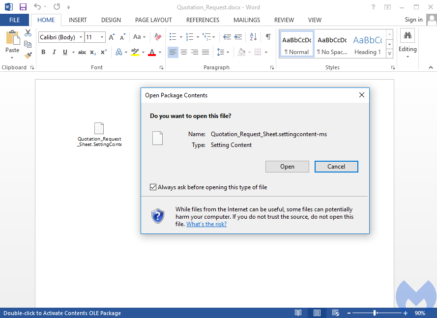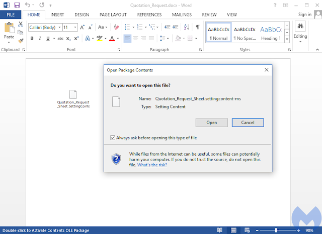 By embedding a specially crafted settings file into an Office document, an attacker can trick a user to run malicious code without any further warning or notification.